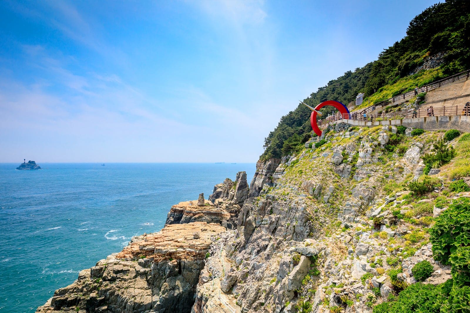 태종대 유원지는 시원하게 펼쳐진 풍경으로 가슴마저 탁 트여요. 드넓은 대한해협도 볼 수 있고 날씨가 좋으면 56㎞ 떨어진 일본 쓰시마섬까지 보일 정도예요. 해안을 따라 소나무를 비롯한 120여 종의 수목으로 풍성한 숲을 이루고 있는 모습이 인상적이에요. 오랜 세월 동안 파도에 부딪혀 역동적인 모습으로 변한 절벽이나 기암괴석은 자연이 만들어내는 절경의 아름다움을 다시 한번 생각하게 해요.